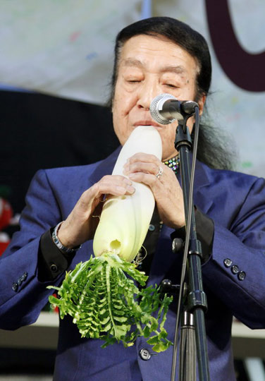 2月15日,在日本神奈川縣的川崎市,一批音樂家用蔬菜、空瓶子和玩偶等特殊樂器舉行了一場別開生面的音樂會。