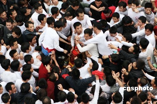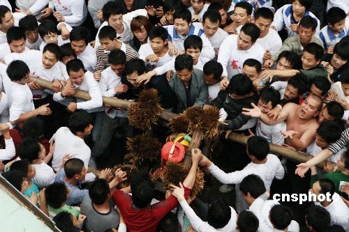 2月16日,農歷正月二十二,廣東汕頭市鹽灶村舉行獨特的傳統(tǒng)“搶財神”活動;顒又,一些被挑選出來的村民將廟里的神像抬出來游行,其他村民則競相涌上前觸摸甚至奪取、拖行神像。按照村里的老話:“老爺公喜歡拖,越拖越興旺!边@一獨特盛會吸引了數(shù)千人前來助威觀看,比過春節(jié)還熱鬧。