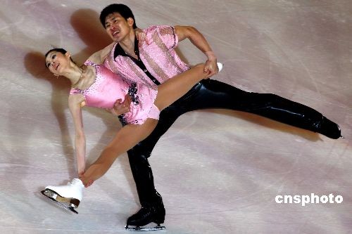 中國(guó)著名花滑組合、本屆大冬會(huì)雙人滑冠軍張丹張昊在表演中。中新社發(fā) 富田 攝