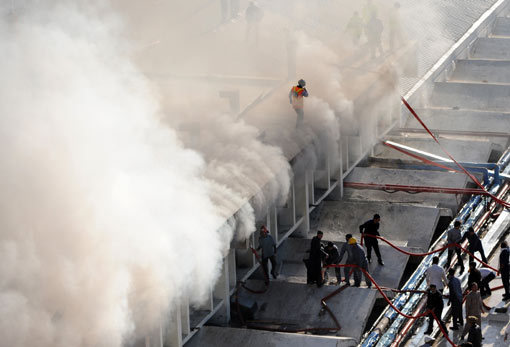 2月26日,位于巴基斯坦首都伊斯蘭堡的萬豪酒店發(fā)生火災(zāi),造成4人受傷。圖為消防人員正在滅火。