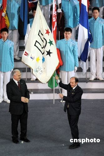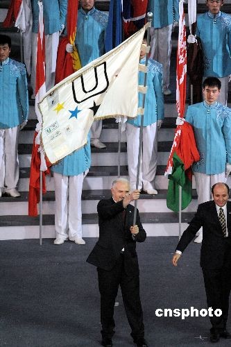 國際大體聯(lián)會旗被轉交到下屆大冬會主辦城市——土耳其埃爾祖魯姆市代表手中。中新社發(fā) 姚庭山 攝