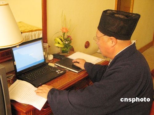 全國政協(xié)十一屆二次會(huì)議開幕前夕,中國道教協(xié)會(huì)副會(huì)長劉懷元在所住酒店房間內(nèi)用電腦起草提案。中新社發(fā) 張子揚(yáng) 攝