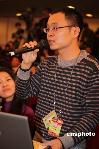 3月4日,在十一屆全國(guó)人大二次會(huì)議舉行的首場(chǎng)新聞發(fā)布會(huì)上,中新社記者孫宇挺就中法關(guān)系、圓明園獸首銅像被拍賣等問題向大會(huì)發(fā)言人李肇星提問。中新社發(fā) 張婭子 攝