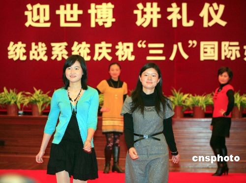 3月4日,上海統(tǒng)戰(zhàn)系統(tǒng)女公務(wù)員歡聚一堂,穿戴自己最靚麗的時裝,登臺展示禮儀和風采。據(jù)悉,這是該機關(guān)舉行“迎世博、講禮儀、展風采、慶祝三八婦女節(jié)”活動之一。中新社發(fā) 潘索菲 攝