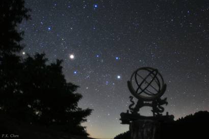 每當夜晚,你走出房間可能會在夜空中看到一顆非常明亮、略帶微紅色的物體,那就是火星。在本圖中,御夫座群星中間的那顆最大亮點就是火星,恰好與夜幕下的中國渾天儀遙相呼應。渾天儀是清康熙年間欽天監(jiān)官員南懷仁等制造,并于1669年進呈朝廷的。儀器由三層環(huán)架組合、上圓下方的造型,是中國傳統(tǒng)渾天儀的表現形式,但在刻度和設計原理上卻采用了西方法度及5世紀托勒密的地心說,可見這是中西科技融合的作品。由于這件渾天儀能夠科學地演示日月交食之成因,一經進入宮廷使用,對于康熙朝再度應用西洋歷法、改進中國測天儀器等都起了積極的作用。