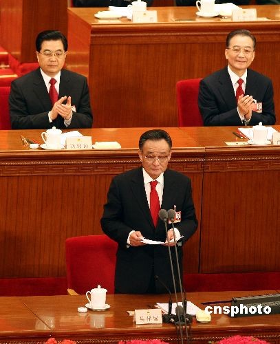 3月5日上午,十一屆全國(guó)人大二次會(huì)議在北京人民大會(huì)堂開幕。吳邦國(guó)主持會(huì)議。中新社發(fā) 杜洋 攝