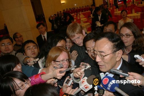 3月5日,十一屆全國人大二次會議開幕會在北京人民大會堂隆重舉行。圖為中外記者爭相采訪西藏自治區(qū)主席向巴平措。中新社發(fā) 金立冬 攝