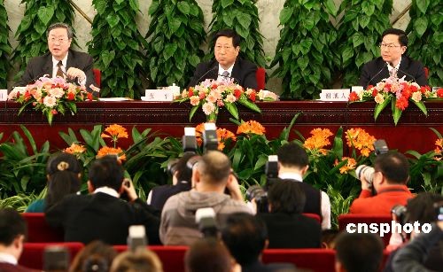3月6日,十一屆全國人大二次會(huì)議在北京人民大會(huì)堂舉行記者會(huì),國家發(fā)展和改革委員會(huì)主任張平、財(cái)政部部長謝旭人、中國人民銀行行長周小川就應(yīng)對(duì)國際金融危機(jī)、保持經(jīng)濟(jì)平穩(wěn)較快發(fā)展問題答記者問。中新社發(fā) 杜洋 攝