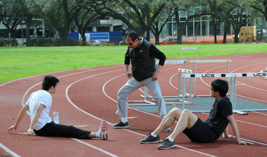 3月6日,劉翔在休斯敦萊斯大學(xué)田徑場進行了體能和跨欄技能訓(xùn)練。當(dāng)日,劉翔結(jié)束了在美國休斯敦的康復(fù)訓(xùn)練,于3月7日啟程回國。圖為劉翔在聆聽教練孫海平的指導(dǎo)。