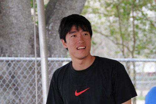 劉翔在休斯敦萊斯大學(xué)田徑場進行體能和跨欄技能訓(xùn)練中面露笑容。
