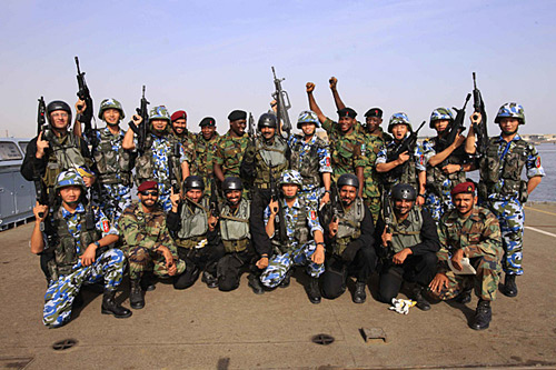 中國海軍特戰(zhàn)隊員、巴基斯坦海軍特戰(zhàn)隊員和尼日利亞海軍特戰(zhàn)隊員在海上直升機滑降演習現(xiàn)場合影。查春明 攝