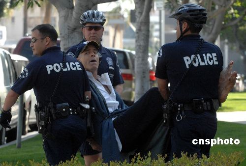 當(dāng)?shù)貢r(shí)間三月十日下午,一名手持“藏獨(dú)”旗幟的男子突然越過(guò)欄桿,沖到中國(guó)駐洛杉磯總領(lǐng)館大門(mén)前,一邊高喊“藏獨(dú)”口號(hào),一邊拍打大門(mén),并試圖打開(kāi)大門(mén)。隨后該男子被警察當(dāng)場(chǎng)擒獲,戴上手銬后被押上警車(chē)帶離現(xiàn)場(chǎng)。中新社發(fā) 張煒 攝