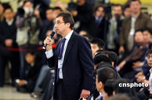 3月13日,十一屆全國人大二次會議閉幕后,國務(wù)院總理溫家寶在北京人民大會堂與中外記者見面。美國《華爾街日報(bào)》記者就中國分散投資風(fēng)險(xiǎn)的策略、能否保證中國不會讓人民幣貶值、中國會不會向國際貨幣基金組織提供資金支持,向溫總理提出三問。中新社發(fā) 傅丹丹 攝