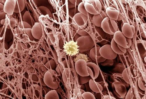 血液凝塊:這張圖看起來(lái)像是紅血球粘在了粘性網(wǎng)上,形成血液凝塊。位于中間的那個(gè)細(xì)胞是白血球。