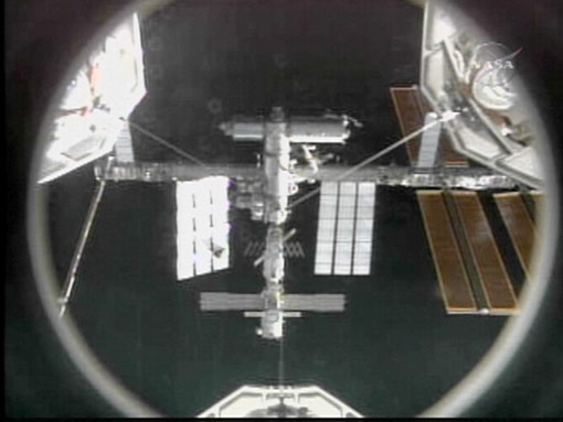圖為美國國家航空和航天局發(fā)布的“發(fā)現(xiàn)”號(hào)與國際空間站對(duì)接電視截圖。
