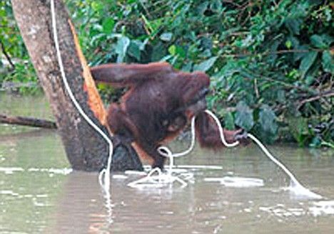 馬來西亞婆羅洲島東北端的一條河流不久前發(fā)生了洪水,一只紅毛猩猩媽媽和她的幼子被困在樹上進退兩難,它們已被困在那里好幾天了。世界自然基金會派遣一個救援小組前往該地區(qū),搭建了一個索橋,使他們能夠靠近這對饑餓的猩猩母子。救援人員想出了一個妙招,他們將一根繩子扔給猩猩媽媽,希望她能抓牢這根繩子游到最近的岸上。但是救援人員十分擔(dān)心,猩猩媽媽會因為怕水拒絕抓住繩子游到岸邊。出人意料的是,母猩猩從樹上爬下來,背著孩子毫不猶豫地跳進洶涌的洪水中,她手里抓著繩子,并確保猩猩幼子的頭部露在水面上,奮力游向河岸,終于安全到達岸上。