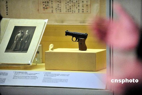 圖為毛瑟手槍(復(fù)制品),是孫中山于一九一五年送給宋慶齡的結(jié)婚禮物;及孫中山和宋慶齡結(jié)婚照(復(fù)制品)。中新社發(fā) 譚達(dá)明 攝