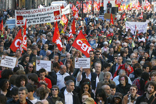 3月19日法國各大工會(huì)在全國各地聯(lián)合組織罷工和示威游行等活動(dòng),抗議政府在應(yīng)對(duì)當(dāng)前經(jīng)濟(jì)危機(jī)過程中忽視勞動(dòng)者權(quán)益和社會(huì)福利。