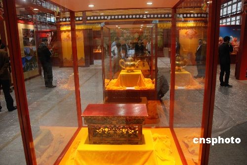 為期五天的“雪域風(fēng)情——藏族非物質(zhì)文化遺產(chǎn)精粹展”三月二十日下午在澳門綜藝館開(kāi)幕,展出了十世班禪獻(xiàn)給中央人民政府的木桌(圖中)等珍貴文物。圖為開(kāi)幕前工作人員在作最后準(zhǔn)備。中新社發(fā) 畢永光 攝