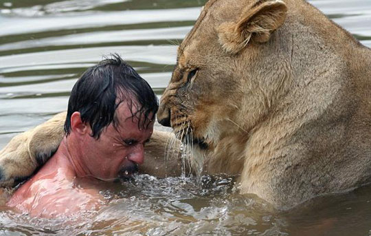 南非動(dòng)物學(xué)家與獅共泳,F(xiàn)年34歲的動(dòng)物學(xué)家凱文經(jīng)常采用不同尋常的方法(一起玩、一起睡覺(jué)、一起游泳等等)來(lái)和常人畏懼的動(dòng)物進(jìn)行交流,同時(shí)和動(dòng)物們建立了很好的個(gè)人感情。和他一起游泳的獅子Meg ,體重185公斤,是個(gè)愛(ài)好游泳的獅子。