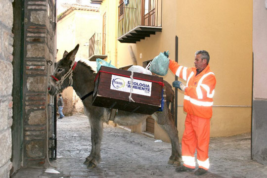 意大利一環(huán)衛(wèi)工帶著驢收垃圾 省錢又環(huán)保。在意大利的卡斯特爾博諾,一名環(huán)衛(wèi)工人帶著驢一起收垃圾。這座西西里島南部的小鎮(zhèn)近日用驢子取代卡車來運輸居民的垃圾。鎮(zhèn)長馬里奧·西塞羅表示,驢子比卡車更環(huán)保,而且費用也更便宜。