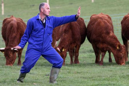 農(nóng)夫?qū)δ膛4蛱珮O!皩(duì)牛彈琴”的成語大家都明白并不是一個(gè)褒義詞,但英國(guó)一個(gè)奶牛場(chǎng)的農(nóng)夫Rob Taverner 卻不這么認(rèn)為,每天早上都會(huì)身穿那套藍(lán)色工作服和一雙防水長(zhǎng)靴,在他喂養(yǎng)的奶牛們面前表演太極拳。他認(rèn)為動(dòng)物非常容易受到人類情感感染,太極可以讓人將一切問題拋在腦后,進(jìn)入一個(gè)較好的狀態(tài),他認(rèn)為他的表演也會(huì)讓這些奶牛感到快樂,從而產(chǎn)出更多的牛奶。好像事實(shí)也證明Rob Taverner所言非虛。