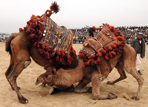 3月23日,阿富汗馬扎里沙里夫,在當(dāng)?shù)嘏e行的斗駱駝活動(dòng)中,兩匹駱駝在進(jìn)行打斗。斗駝與斗狗、斗羊和馬背叼羊比賽一樣是阿富汗民眾在阿歷新年前后的重要慶祝活動(dòng)。