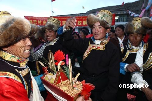 3月23日晚,西藏山南地區(qū)結(jié)巴鄉(xiāng)結(jié)巴村的村民自發(fā)組織篝火晚會,跳起鍋莊舞喜迎西藏百萬農(nóng)奴解放日。圖為村農(nóng)民互敬象征五谷豐登的“切瑪”。結(jié)巴鄉(xiāng)是西藏第一個(gè)“朗生互助組”的誕生地。西藏實(shí)行民主改革后,廣大農(nóng)奴獲得了解放,自己當(dāng)家做主,并擁有了土地。中新社發(fā) 杜洋 攝