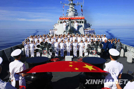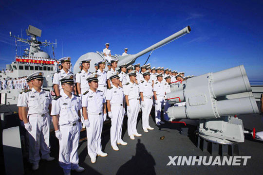 “廣州”艦全體官兵日前在巴基斯坦舉行的“和平-09”多國聯(lián)合軍事演習(xí)中出色完成了各項演習(xí)任務(wù),充分展示了中國海軍威武之師、文明之師、和平之師和勝利之師的良好形象,促進(jìn)了與參演各國海軍的交流與合作,增進(jìn)了中巴兩國、兩軍的互信與友誼。