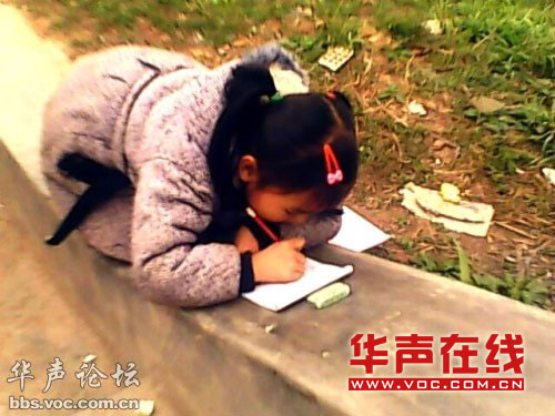 “盡管是初春,但若有若無的雨絲,也讓人忍不住要裹緊衣服。女孩一直在專心地做著作業(yè),并沒有因為梯子上面有人走下來而受到影響。”發(fā)帖人稱自己在一個小區(qū)工地發(fā)現(xiàn)這名小女孩并和她攀談起來:“我問她為什么不回家,偏偏跑到有雨的外面做作業(yè)?她調(diào)皮地朝我做了一個鬼動作,‘我媽媽叫我在這里做作業(yè)!