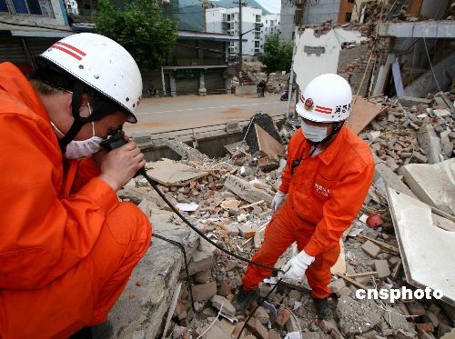 資料圖片:2008年5月15日,福州消防支隊赴川抗震救災官兵在青川縣賓和路一家主建筑已全部坍塌的大型汽車維修廠,用生命探測儀成功解救出一名被困女工。當時,在接群眾求助后,救援隊立即趕赴現(xiàn)場,搜索分隊首先用生命探測儀確定了女工被困的大概方位,救援分隊迅速啟動救生氣墊,并用鐵鍬和雙手以土工的方式為被困女工打開了一條生命通道,半個小時后,被困女工被成功救出。中新社發(fā) 朱曉航 攝