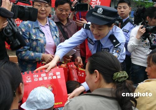 5月6日,臨近“5.12”一周年和母親節(jié)的日子,抗震英模蔣敏來到位于彭州市龍門山鎮(zhèn)東林寺板房區(qū),為那里的受災(zāi)民眾捐出自己用一個月的工資購買的彩虹電滅蚊器。彭州市龍門山鎮(zhèn)地處龍門山脈,北與汶川縣和德陽什邡接壤,該鎮(zhèn)的東林寺板房區(qū)現(xiàn)安置了九峰村461戶群眾,1600余人。去年“5.12”地震中,九峰村村民90%的住房垮塌或成為危房。中新社發(fā) 霍潺 攝