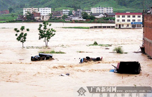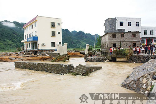 6月9日凌晨3時許,與貴州交界的環(huán)江毛南族自治縣馴樂苗族鄉(xiāng)遭受嚴重洪澇災害,洪水淹沒大片田地,卷走多輛停放在馴樂街的汽車,馴樂河大橋坍塌,一名老年男子隨著被洪水卷走的房屋而失蹤。
