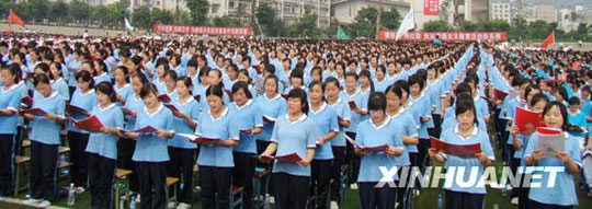 6月25日,在四川鄰水縣鄰水實(shí)驗(yàn)中學(xué)體育場,來自眾多學(xué)校的上萬名師生齊聲誦讀國學(xué)經(jīng)典。