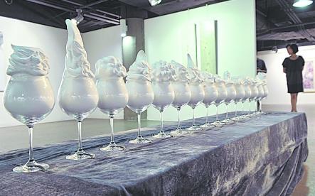 25日下午,記者在水碾河藍(lán)色空間畫廊內(nèi),在剛剛布展完畢即將在26日下午正式開展的“新生———西南地區(qū)美術(shù)院校在校生選拔展中美巡展”中國站展覽的展廳里,一組15個(gè)遠(yuǎn)遠(yuǎn)看去完全就是冰淇淋一般的雕塑作品立即吸引了記者的注意。這組名為《石膏達(dá)斯》的雕塑,全部是用高腳紅酒杯盛裝的,雪白的“冰淇淋”從杯底一直延伸到杯口,并形成各式各樣的宛如冰淇淋塔尖的形狀,但走近仔細(xì)觀看,卻發(fā)現(xiàn)這些冰淇淋塔尖其實(shí)都是一個(gè)個(gè)物體的變形,有汽車,有肯德基老人,有狗……25日記者通過電話聯(lián)系到了身在北京的參展藝術(shù)家、這些“冰淇淋”的作者張華,他表示,這些作品的靈感正是來自于冰淇淋,當(dāng)時(shí)他覺得冰淇淋塔尖的形狀變換很有意思,于是想到了把生活中常見的消費(fèi)場所、消費(fèi)標(biāo)志、人物、動(dòng)物融入冰淇淋式的雕塑中,我覺得“這既是一種好玩的雕塑,又是一種反映消費(fèi)社會(huì)現(xiàn)實(shí)的雕塑”。記者了解到,這些冰淇淋的雕塑售價(jià)令人咋舌:一組15個(gè),售價(jià)5萬元,也就是說每個(gè)售價(jià)約等于3333元!