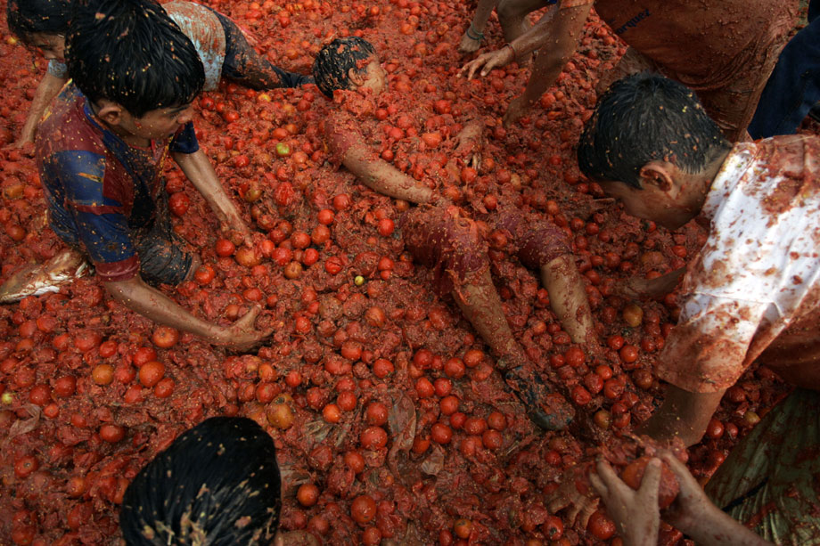 2009年6月14日,哥倫比亞第五屆番茄狂歡節(jié)開幕,參與者互相投擲西紅柿,盡情狂歡慶豐收。來自哥倫比亞各地的狂歡者們?cè)萍谑锥疾ǜ绱髺|北部的蘇塔馬錢小鎮(zhèn),街道上立刻變成了西紅柿紛飛的戰(zhàn)場(chǎng)。雖然每個(gè)人的臉上身上沾滿了西紅柿汁,但人們還是樂此不疲又是丟又是砸,把成堆的西紅柿當(dāng)成打仗的“武器”。還有人特地穿上白衣白褲,身上越紅,心里就越痛快。