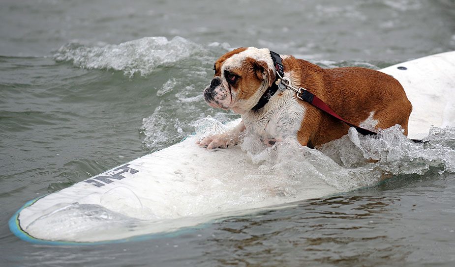 6月20日,在美國加利福尼亞州帝國沙灘舉行了一場小狗沖浪比賽,小狗們表現得十分認真。