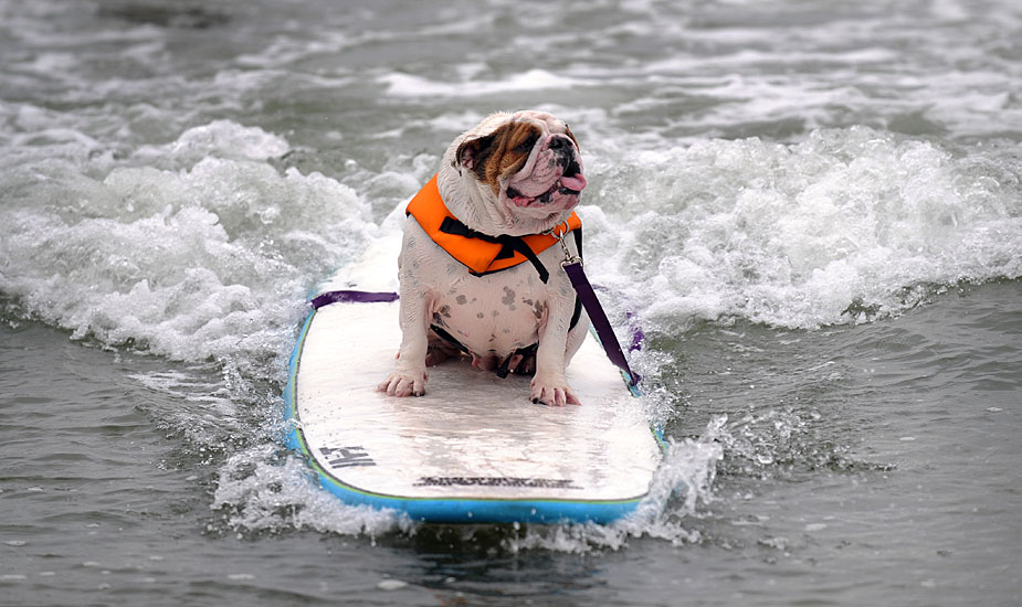 6月20日,在美國(guó)加利福尼亞州帝國(guó)沙灘舉行了一場(chǎng)小狗沖浪比賽,小狗們表現(xiàn)得十分認(rèn)真。