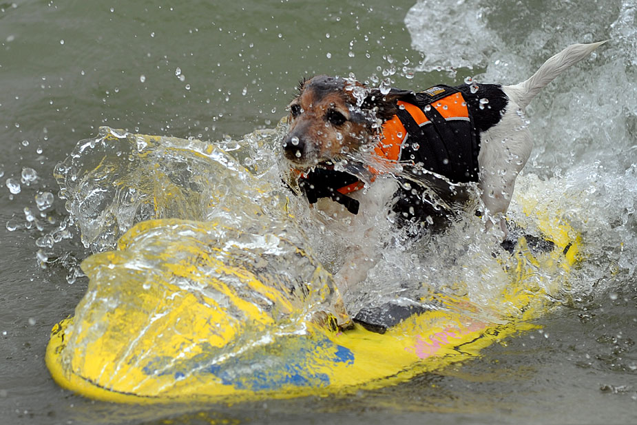6月20日,在美國加利福尼亞州帝國沙灘舉行了一場小狗沖浪比賽,小狗們表現(xiàn)得十分認真。