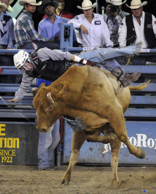 圖為6月24日在美國內(nèi)華達(dá)州舉行的騎牛大賽。