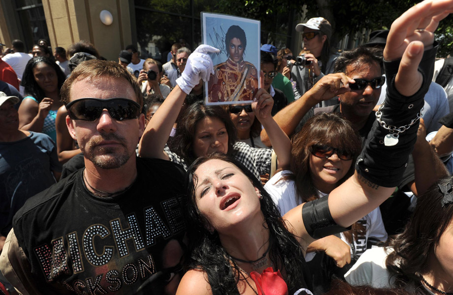 數(shù)百名沒有入場券的歌迷聚集在附近的警戒線外高呼邁克爾的名字,共同悼念一代“流行天王”。 中新社發(fā) 張煒 攝