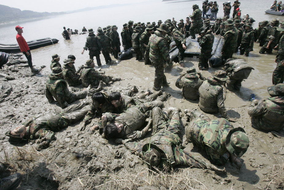 當?shù)貢r間7月30日,在首爾的美軍基地參加軍訓(xùn)夏令營的韓國數(shù)百名學生來到金浦進行了泥地訓(xùn)練,場面十分激烈甚至殘酷。