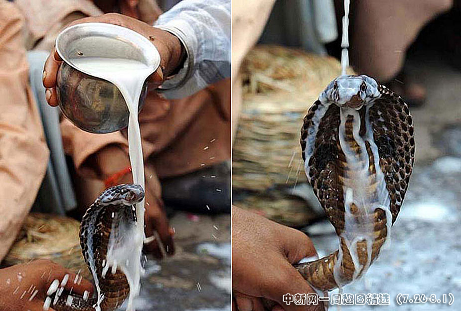 7月26日,印度北部城市阿姆利則一座印度教神廟內(nèi),耍蛇人將眼鏡蛇浸入牛奶中。點(diǎn)擊觀看詳細(xì)內(nèi)容