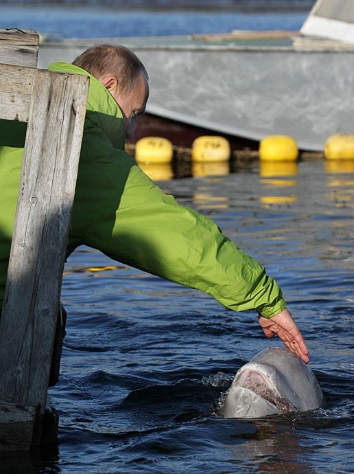 俄羅斯總理普京7月31日在太平洋的契卡洛夫島為一條白鯨裝上衛(wèi)星追蹤器。其后他更幫手喂其他白鯨魚(yú)吃。