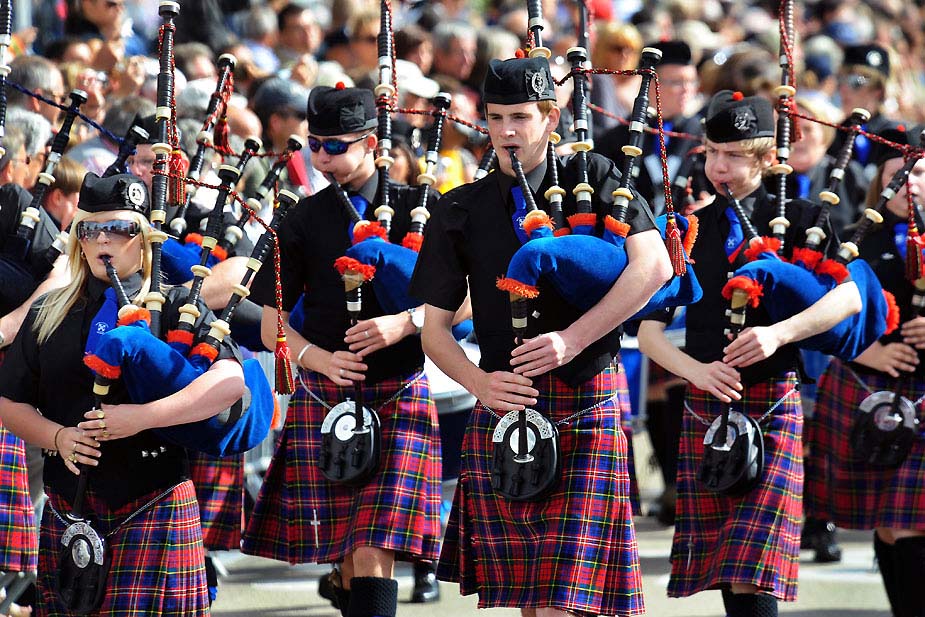 8月2日,蘇格蘭梅西爾風(fēng)笛樂隊(duì)的藝術(shù)家們?cè)诼謇锇嚎藸柼匚幕?jié)上進(jìn)行表演。