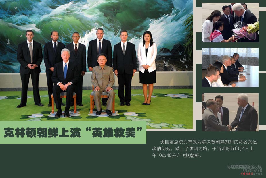 中新網(wǎng)本周熱點(diǎn)人物之克林頓——8月6日,美國(guó)前總統(tǒng)克林頓在平壤斡旋成功,朝鮮領(lǐng)導(dǎo)人金正日下令特赦在押的兩名美國(guó)女記者。三十二歲的凌志美、三十六歲的李承恩(前譯李尤娜)與克林頓所乘坐的飛機(jī)在洛杉磯附近的伯班克機(jī)場(chǎng)降落,兩名女記者下機(jī)時(shí),與家人團(tuán)聚激動(dòng)得泣不成聲。