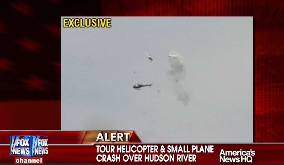 8月8日,紐約市曼哈頓西側(cè)的哈德遜河上空,一架觀光直升飛機(jī)和一架小型飛機(jī)相撞,兩飛機(jī)雙雙墜入河中。據(jù)稱(chēng)觀光直升飛機(jī)上載有五名意大利游客和一名飛行員,而小型飛機(jī)上則有三人。圖為電視臺(tái)播放的兩飛機(jī)相撞的視頻截圖。