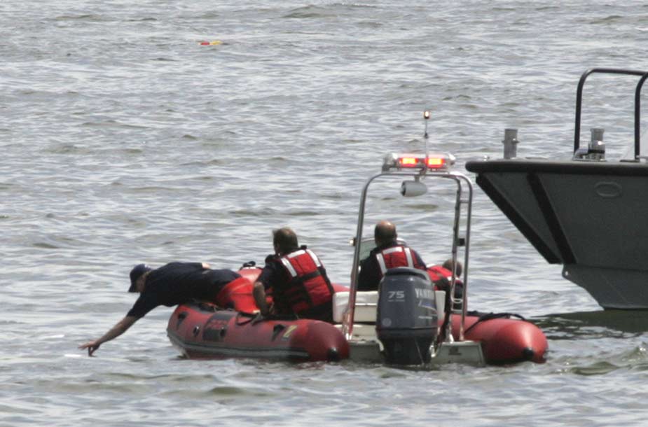 8月8日,紐約市曼哈頓西側(cè)的哈德遜河上空,一架觀光直升飛機(jī)和一架小型飛機(jī)相撞,兩飛機(jī)雙雙墜入河中。據(jù)稱觀光直升飛機(jī)上載有五名意大利游客和一名飛行員,而小型飛機(jī)上則有三人。圖為工作人員在現(xiàn)場救援。