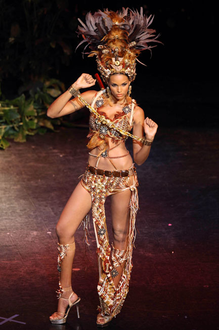 8月10日,2009年世界小姐大賽上,來自84個國家和地區(qū)的佳麗進(jìn)行民族服飾的展示,各國佳麗分別穿著含有自己民族風(fēng)格元素的時尚晚裝亮相,現(xiàn)場頓時色彩斑斕,美不勝收。