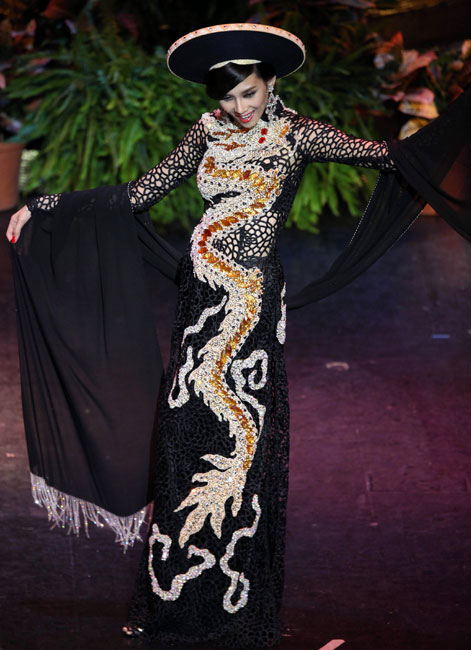 圖為越南小姐武文杰穿著融入民族元素的服飾登臺展示。